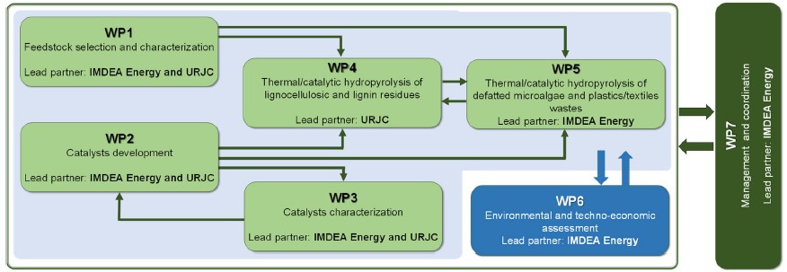 El proyecto HYPY-CAT, se estructura en 7 paquetes de trabajo (WP), que cubren la cadena de valor de la hidropirólisis catalítica (CHP).