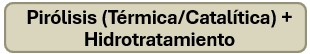 Esta es una estrategia de dos pasos para mejorar el aceite pirolítico. Primero, se realiza una Pirólisis (con o sin catalizador) para descomponer la materia prima y generar una fracción líquida (bio-aceite). Posteriormente, este bio-aceite condensado es sometido a un hidrotratamiento Catalítico separado en presencia de hidrógeno para eliminar heteroátomos y saturar las olefinas. Limitaciones: Requiere altas presiones de H2 y la formación de coque durante el calentamiento del bio-aceite condensado puede ser un problema.