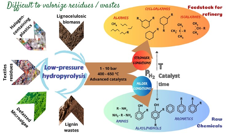 El objetivo principal del proyecto HYPY-CAT es estudiar la viabilidad de la hidropirólisis catalítica a baja presión para la valorización de residuos orgánicos de naturaleza compleja, como la lignina, la biomasa lignocelulósica, los residuos de microalgas desgrasadas, residuos plásticos y textiles, caracterizados por una presencia significativa de especies funcionalizadas, con contenido relativamente alto de N y O.
